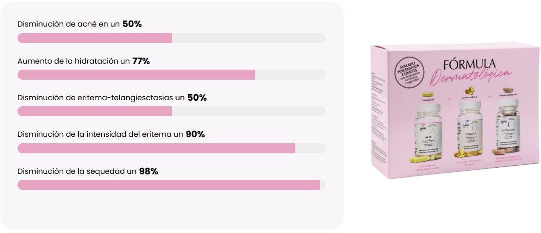 La fórmula dermatológica de inMe LAB combina vitaminas, minerales, colágeno hidrolizado, ácido hialurónico, antioxidantes y omega 3 de alta calidad, demostrando eficacia en la mejora de la hidratación, elasticidad y luminosidad de la piel.