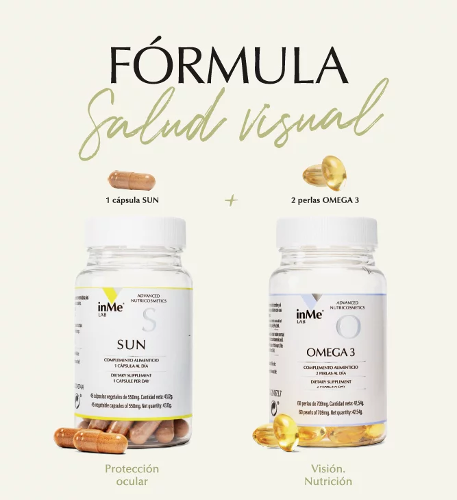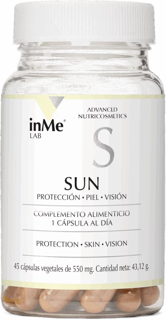 - inMe SUN contiene carotenoides antioxidantes como el betacaroteno, licopeno y luteína para proteger tu piel y ojos del sol y evitar su envejecimiento prematuro.