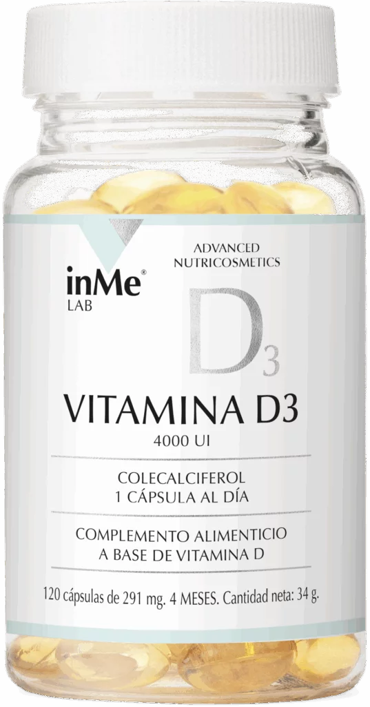 - inMe VITAMINA D3 contiene 4000 UI de vitamina D3 en forma de colecalciferol para mantener unos buenos niveles sanguíneos, potenciar el sistema inmune, mantener unos huesos y músculos fuertes y evitar el cansancio.